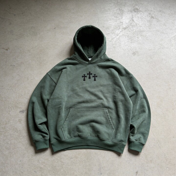 A washed forest green hoodie with a quiet front and a message that carries weight on the back. Three crosses on the chest; the reminder on the reverse says the rest: